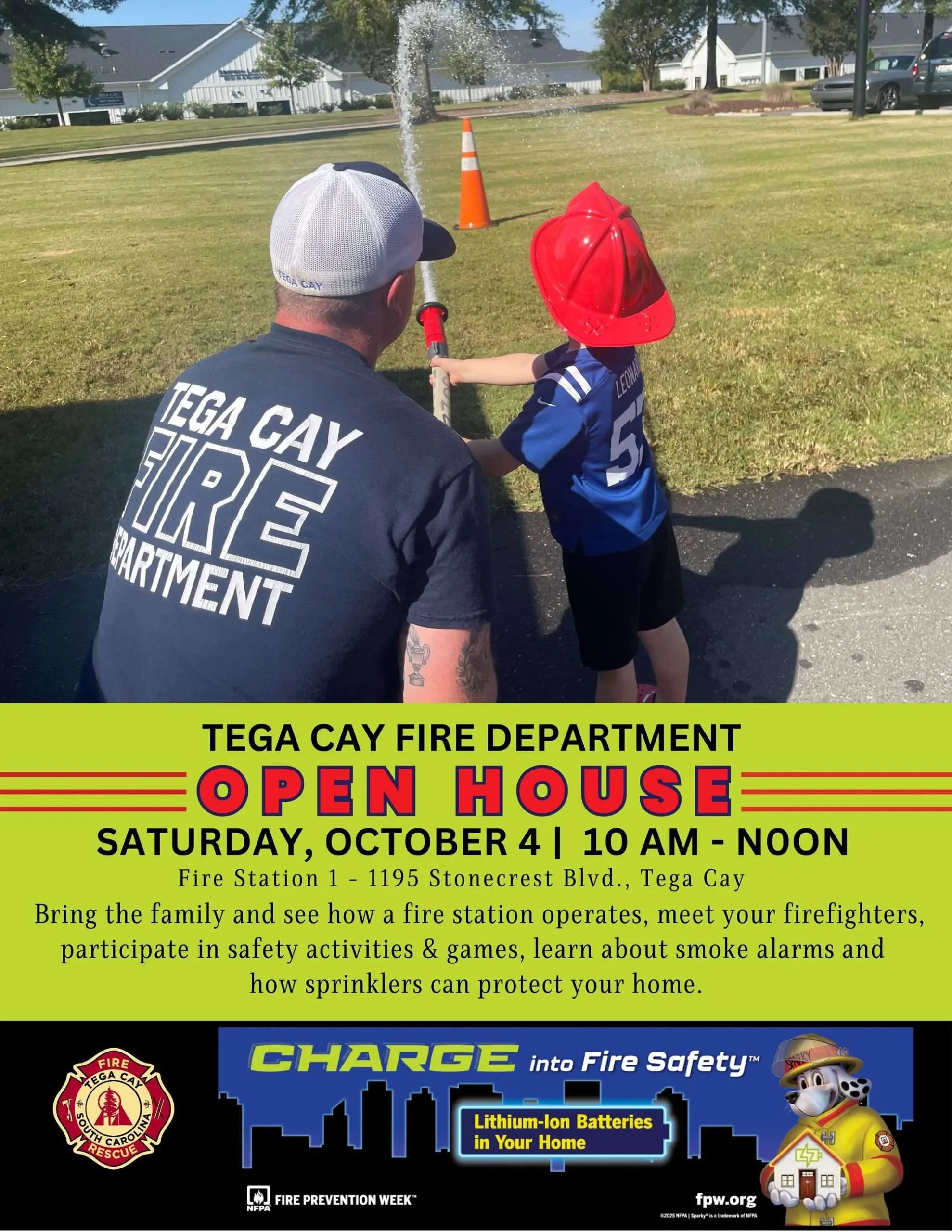 The Tega Cay Fire Department has an Open House on Saturday, October 4th, 2025 from 10:00 AM to 12:00 PM at Fire Station 1 on Stonecrest Blvd. . Meet your firefighters, tour the fire station, Play safety games & activities, and more. Watch this Talk of the Town video to learn about fire safety week, Lithium battery charging safety and more about the open hose.